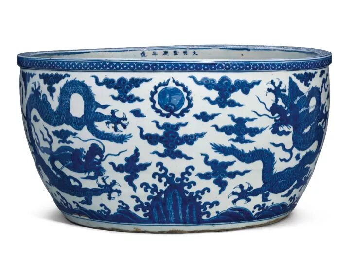 隆庆在位仅六年,其间景德镇地区又屡遭水患、祝融之灾,因此存世的隆庆官窑数量极少,而且多见盘、盌等小品,大器尤其罕见。此缸口径近70公分,为隆庆官窑中最大的一类,迄今似仅知其他三件经著录,皆有修复,见:中国国家博物馆一例,载于《中国国家博物馆馆藏文物研究丛书–瓷器卷–明代》,上海,2007年,页163,图版88号(图一);日本出光美术馆一例,载于《出光美术馆藏品图录–中国陶磁》,东京,1987年,图版713号;以及香港佳士得拍卖一例,见1997年 4月28日,拍品674号。