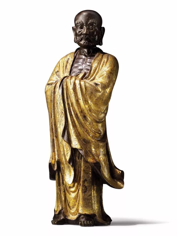 此像造工精细,达摩低眉垂目,神情庄严,令人心生敬畏之情;衣袍随风飘曳,皱褶流畅自然,雕工逼真灵动,当为晚明铜器造像中不可多得之作。类似的达摩造型亦见于同期不同材质,如香港佳士得曾拍卖一尊何朝宗造德化白瓷达摩立像,形态与本尊相若,见2014年11月26日,拍品3120号。