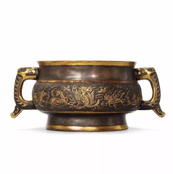 8117 晚明 局部鎏金铜错银海兽纹龙耳簋式炉
