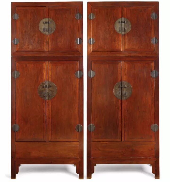 本拍品乃唯一一对在年代、造型、尺寸相近的四件柜著录例子当中,使用独板黄花梨做门板心的柜子。见一对极为相似,为洪氏旧藏,著录于安思远,尼古拉斯.葛瑞德雷,柯安霓合着,《洪氏所藏木器百图》,第一册,纽约,1996年,页188,73号,拍卖于纽约佳士得,2013年9月19至20日,拍品1566号(图三);另见Madame Henri Vetch珍藏,著录于古斯塔夫?艾克著《中国花梨家具图考》,香港,1978年,页125,图版101号。以上两对柜子均使用光素面板及素直牙条制作,但其面板心均是拼板,而非像本拍品般使用独板。