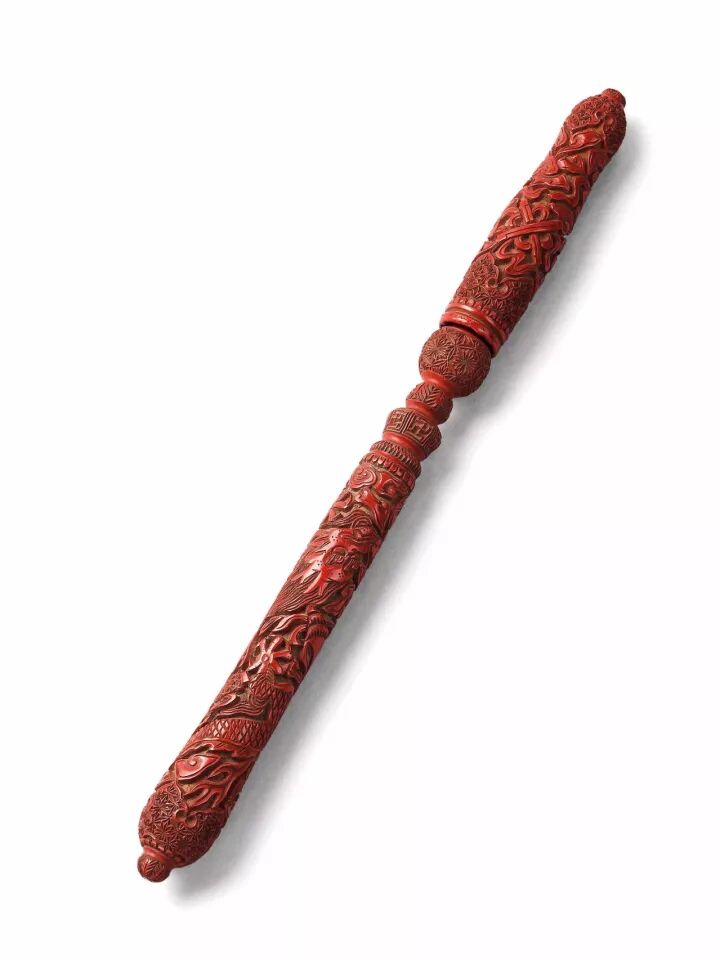 说明:铭万历款的漆笔非常稀少,本拍品以剔红技法雕五爪游龙腾跃于火焰、卷云、杂宝间,笔沿一圈刻五个开光,内描金刻「大明万历年制」款,刀法明快利落,异常罕见,有可能为孤品。尚知另外两件带万历款的漆笔,但均为彩绘描金,笔尾双长方框内书直行年款,与本拍品年款的处理迥异。第一件例子饰黑地描金龙纹,藏日本德川美术馆,著录于1997年出版《唐物漆器》,图154号。第二件饰红地彩绘莲纹,2005年5月30日于香港佳士得拍卖,拍品1226号。亦可参考国立故宫博物院藏一对嘉靖款彩漆龙纹笔,同样书双方框直行年款,见2008年台北出版《和光剔采 – 故宫藏漆》,图版94号。
