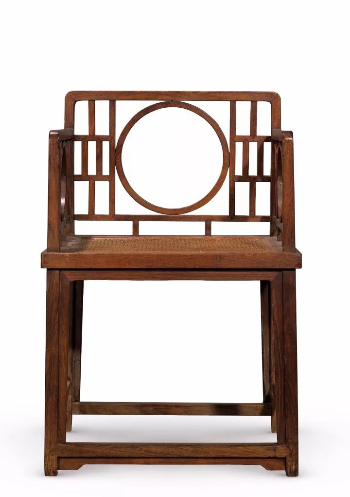 可比较其他造型相若但年代尺寸迥异的例子,见一对有相同铜吊牌设计的柜子,为Frederic Mueller旧藏,著录于安思远著《中国家具》,纽约,1970年,图版130号,拍卖于纽约佳士得,1991年11月27日,拍品237号(图四);另见安思远,同上,图版132号的一对贴皮柜子;还有两对黄花梨贴皮四件柜,一对为Richard Fabian神父旧藏,拍卖于纽约苏富比,2016年3月15日,拍品42号;及叶承耀医生攻玉山房旧藏一对,著录于《楮坛室梦旅:攻玉山房藏明式黄花梨家具》,香港,1991年,页119,46号,拍卖于纽约佳士得,2002年9月20日,拍品60号。其他有雕刻造型的柜子,可参阅前加州古典家具博物馆旧藏,拍卖于纽约佳士得,1996年9月19日,拍品30号,及纽约大都会博物馆中国庭园Astor Garden。