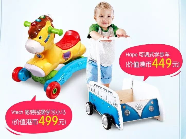即送价值港币499元Vtech 驰聘摇摆学习小马(万宁商店)或价值港币449元Hape可调式学步车(屈臣氏商店)。