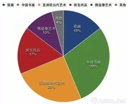 从这些高价成交的拍品一览表来看,雅昌艺术网再次梳理了各个门类占据的比例,如上图所示,在48件超过2000万港币成交的拍品中,中国书画占据了14个席位,其中崔如琢书画有5幅,其他的分属李可染、傅抱石、张大千三位近现代书画大师,而中国古代书画部分仅有3幅作品,且排名靠后,单件成交价在3000万港币以内,中国嘉德(香港)为主要的拍卖阵地。