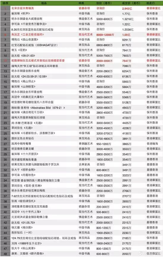 雅昌艺术网统计了五家拍卖公司单件成交价超过2000万港币的拍品,一共是48件,涉及了瓷器杂项、中国书画、亚洲现当代艺术、珠宝尚品、佛造像艺术、青铜器艺术等六大门类,标红的为创纪录的拍品。