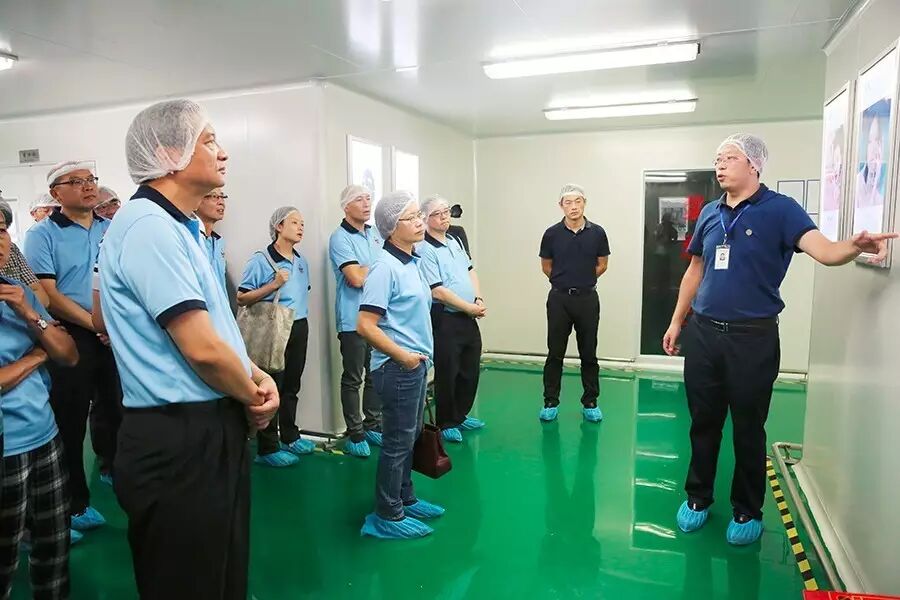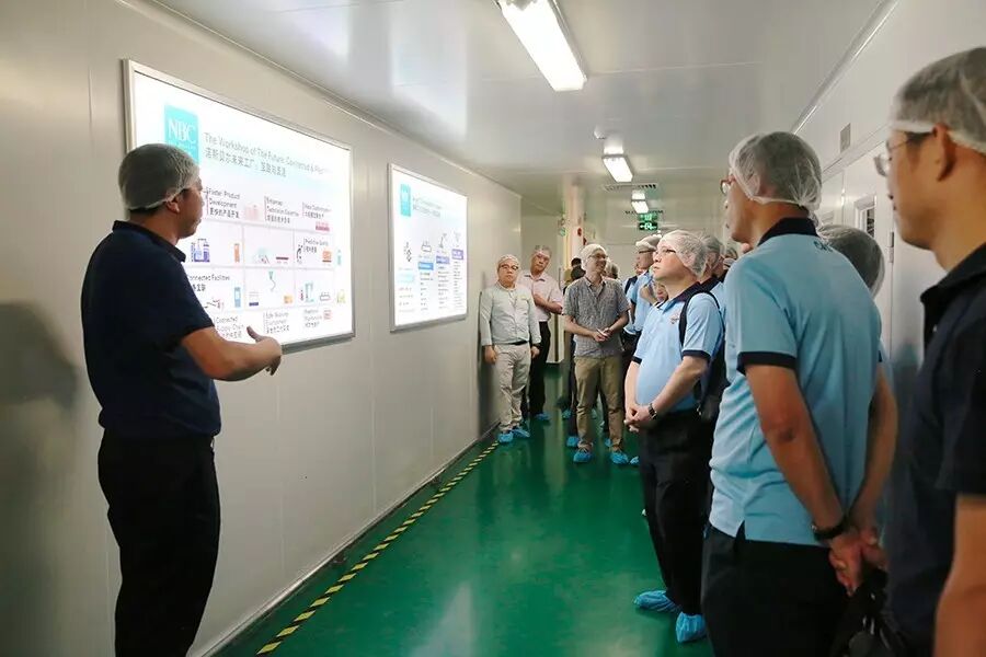 交流团认真聆听讲解员介绍诺斯贝尔是如何发展到面膜年产能7亿片的历程