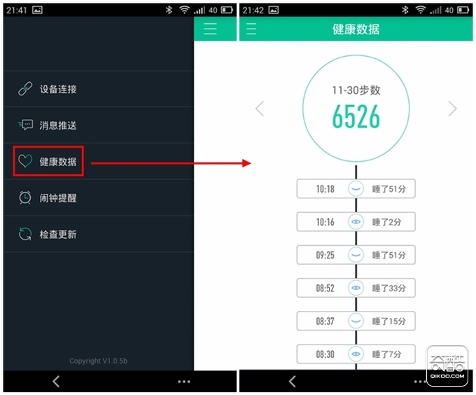 Classic”手环的手机端APP界面功能几乎跟“小黑”一样简洁明了。平时如果使用运动记录功能较少的话,应该很少会打开手机端APP。此界面为主页面,点击左上角菜单能打开所有分菜单。
