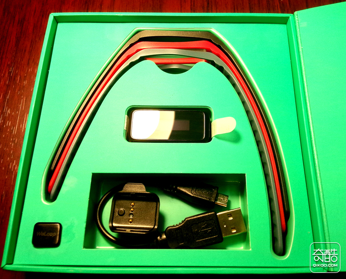 ↑所有配件在此:红、蓝、黑3种颜色的表带各一条;手环主体一个;充电器夹具一个;连接夹具的mini
