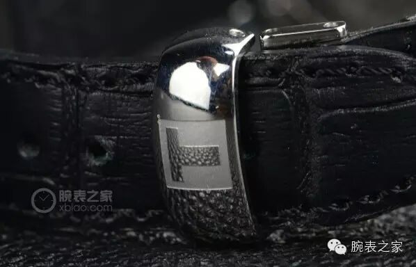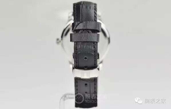 黑色的皮质表带,做工精细,纹理清晰,边缘压线均匀且规则。