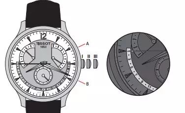 日期可在表冠处于位置III时进行设置。修正器B用于选择需要设置的指示器。修正器A用于所选的指示器。