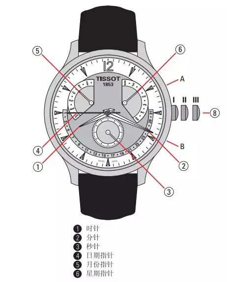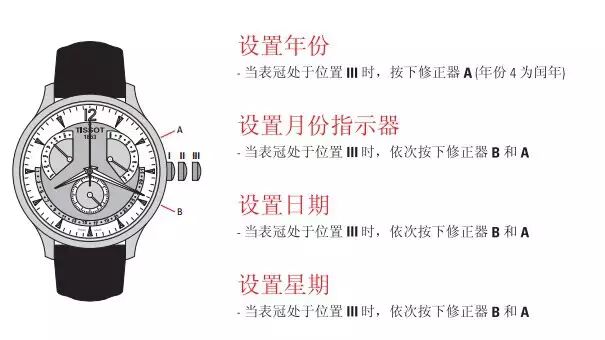 天梭石英万年历表时间、日期设置和重置指示器方法