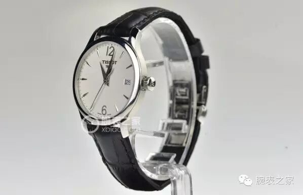 腕表黑色皮带以折叠式表扣链接,不仅开合方便而且不易脱落,安全可靠;表扣上压印天梭标识“T”,经过抛光打磨,圆润有光泽。