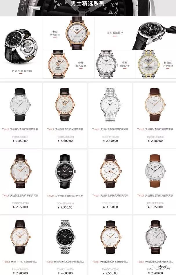 男表依然是天梭表的主要产品。详细看这些表款和价格,再次确认为什么天梭表如此受追捧?因为表款众多、设计讨人喜欢、价廉物美啊!基本还是以两三千、三五千元人民币价格为主。而且,有了线上官方旗舰店,以后了解天梭表,查阅价格就方便很多了。以前要了解一个腕表品牌的产品价格,无论在实体店还是在网络上,可麻烦着呢