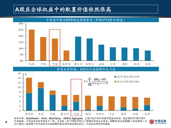 从国内资金角度看,只有权益类资产最具吸引力。,除了房子外,银行理财产品、短期理财型保单、货币市场基金等传统低风险高收益理财型资产,,这些资产的预期收益率趋于下降,只剩证券类资产有配置提升空间。