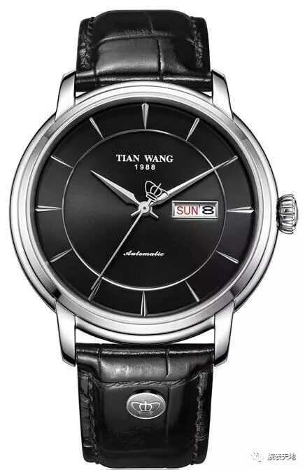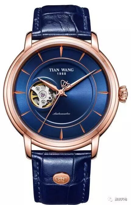 时、分指针棱角分明,仿佛一位坚守信念、卓尔不群的绅士。秒针的尾部是一顶美轮美奂的“皇冠”,寓意尊贵的天王。表盘的左侧局部镂空,露出律动的摆轮。这种设计,俗称露摆,将部分机械结构“赤裸裸”地展现在你面前,是机械表很令人着迷的特质。精密机械的美感,从中可以窥探一二。盘面右侧则是天王名称及其成立年份。