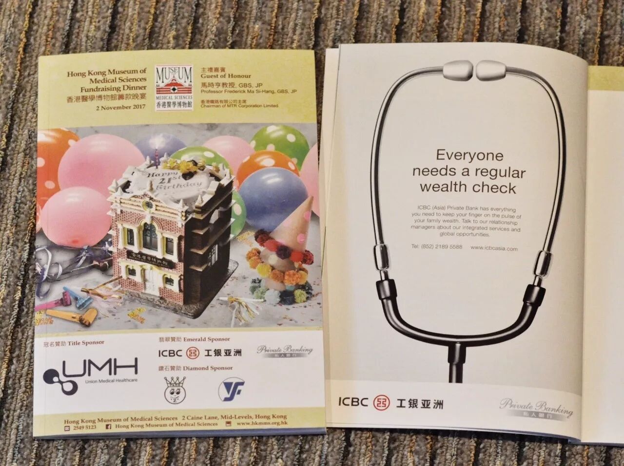 香港醫學博物館此次對工銀亞洲私人銀行的慷慨捐助表示十分歡迎,在現場多處宣傳工銀亞洲私人銀行品牌標識之餘,並在籌款晚宴特輯的黃金位置刊登其廣告。