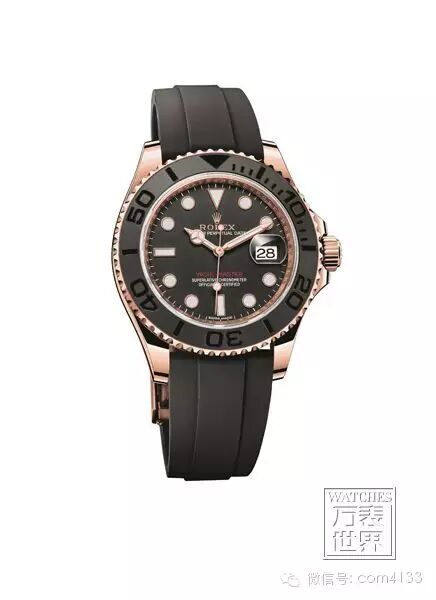 劳力士蚝式恒动游艇名仕型(Yatch Master 40)永恒玫瑰金版本,表带内嵌钛镍合金片,叫Oysterflex,意思是本来应该是蚝式表链的,但是是用橡胶做的可跟蚝式表链一样结实。我们是不是可以【把这个Oysterflex用在我的其他劳力士上】?别做梦了,Oysterflex与其他款式表带不可互换。所以喜欢劳力士有受不了钢链带的朋友,就买这款(好像是唯一的)橡胶表带的劳力士。