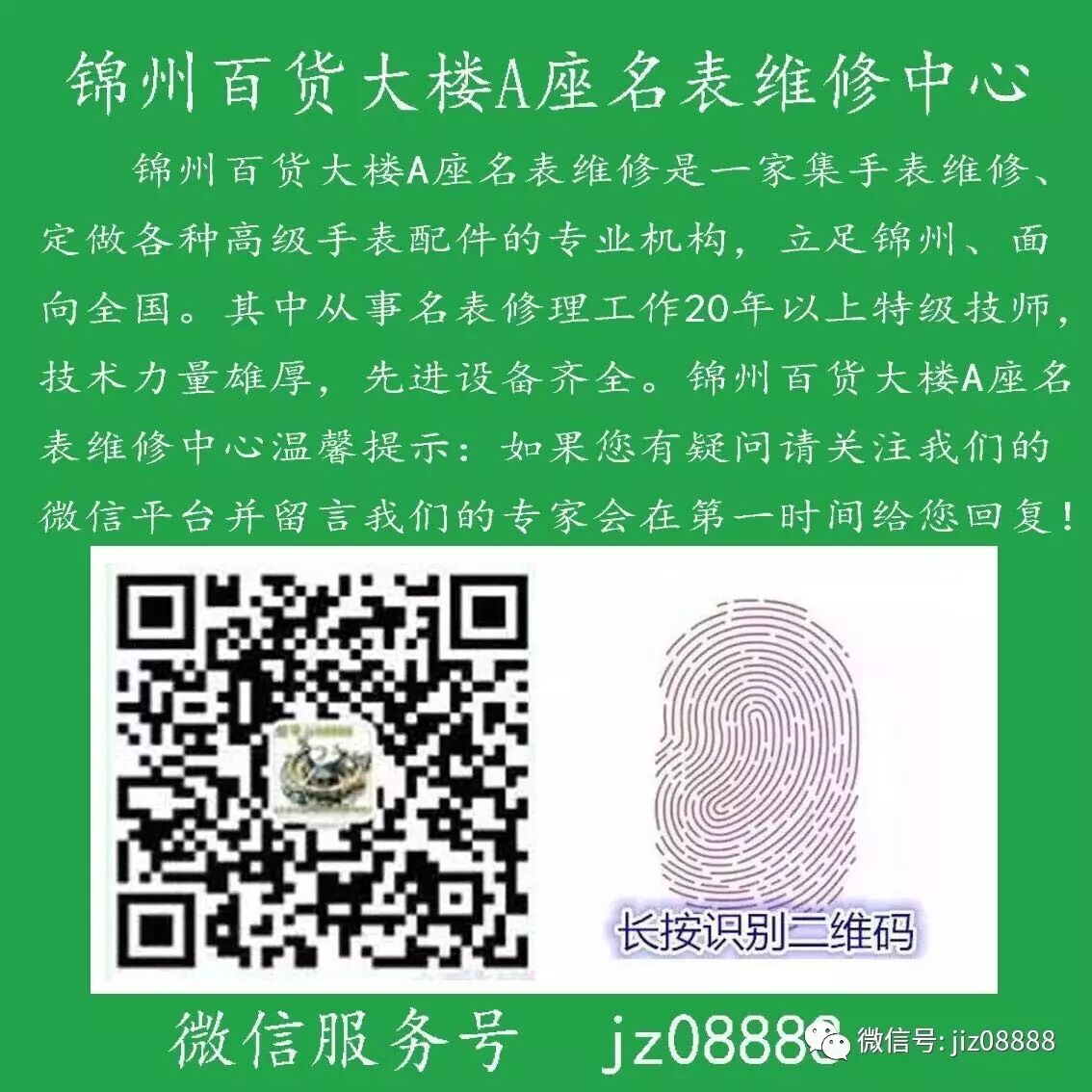 锦州百货大楼A座名表维修中心(中央大街店),是辽西最大的名表维修中心,专营名表精修,品牌特约维修,定制表带等业务,配备瑞士全套专业维护设备、工具设备齐全∶