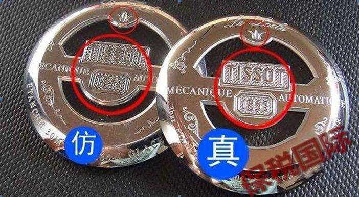 正品天梭手表商标机心内的夹板或摆铊上标有天梭商标标牌字样;机心在表壳组件中稳固;机心内清洁。假冒天梭手表机心内的夹板或摆铊上无天梭商标标牌字样,或天梭商标标牌字迹粗糙、模糊、歪斜、或简单地用小铜片粘贴;机心内不清洁,有些机心内有铜屑、头发丝、指纹等。