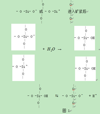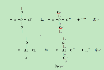 石英与长石都属于架状结构硅酸盐矿物,它们具有相同的晶体结构:硅(铝)氧四面体与4个硅氧四面体共角顶相互联结,形成在三维空间无限延伸的架状结构。两者在水溶液中的荷电机理也基本相同:矿物经破碎后,晶体破裂,硅(铝)氧键断裂,在水溶液中吸附定位离子,生成羟基表面,在不同介质pH 值条件下,产生解离或吸附,形成不同的表面电位。