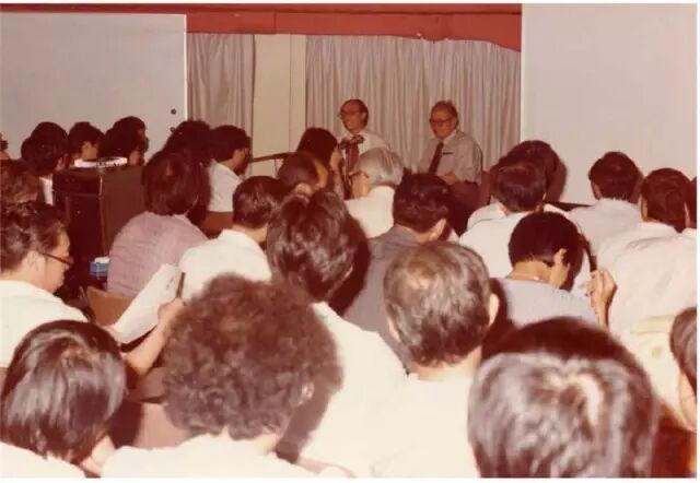 1985年,王世襄(右一)在《明式家具珍赏》发布讲座现场
