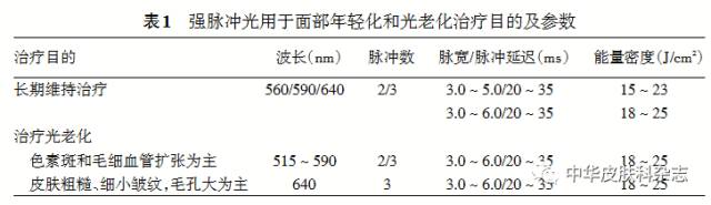参数选择:若以治疗色素类及血管类皮损为主,可选择较短波长的滤光片(515 ~ 590 nm);治疗色素病时,选择短脉宽;治疗血管类疾病时根据血管直径调节脉宽,细血管用短脉宽,粗血管用长脉宽;若以改善肤质、细小皱纹等为主,宜选择较长波长的滤光片(640 nm)以及长脉宽。治疗终点反应:治疗色素病时,以色素斑变得更为明显、色素斑周围轻微水肿为终点;治疗轻度表浅毛细血管扩张时,以血管颜色变淡、模糊、暂时消退或呈浅灰色为终点;治疗真皮结构改变的病变以患者感觉温热即可。见表1。