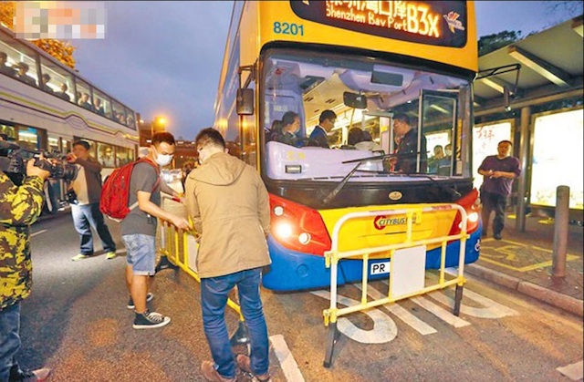 ▲示威者用横栏阻截前往深圳湾口岸的巴士