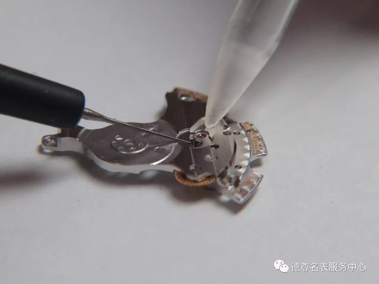 技师给予腕表机芯进行加油工作