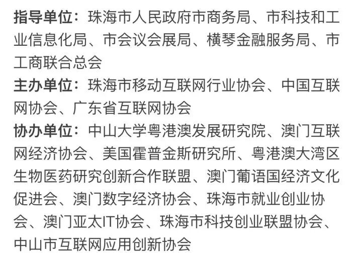 支持单位:中国移动通信集团广东有限公司珠海分公司、中国联通网络通信有限公司珠海市分公司、中国电信珠海分公司、香港Linux商会、香港中小企商会联席会议、云创科学艺术文化促进会、中山市国学促进会、中山国学堂、、佛山陶瓷工业协会营销分会、佛山市陶瓷学会、珠海大数据与云计算学会、广东飞企互联科技股份有限公司、澳门跨境说网络科技有限公司、广东卫戍投资管理集团有限公司