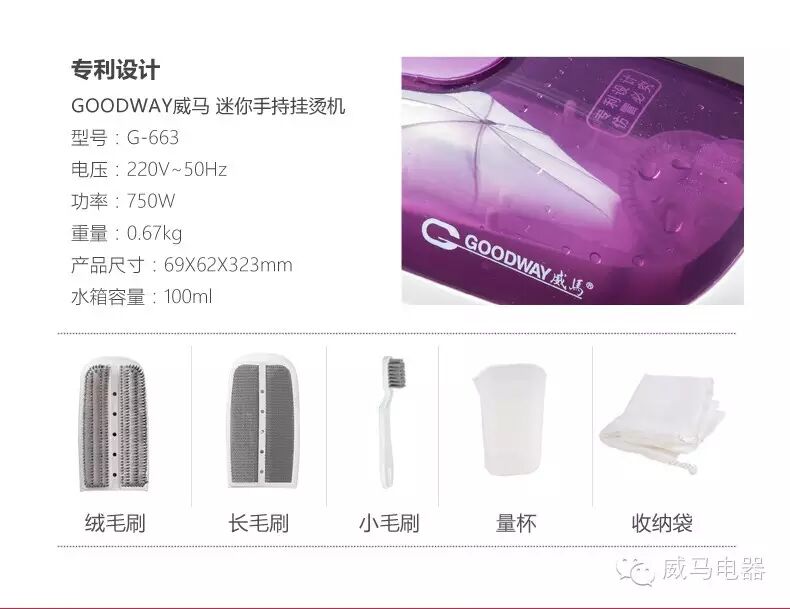 家居旅行挂烫帮手 挂式蒸汽挂烫刷家用迷你 G-663紫色 120℃以上高温蒸汽强力喷发!挂烫、杀菌、除螨、祛味!无须烫衣板,只需加水通电30多秒,即可喷出高压蒸汽。摆脱时间和空间上熨衣限制,只要悬挂即可整洁衣物,比传统熨衣更方便快捷。120度以上的高温蒸汽不仅可以干洗衣物,还可杀菌、消毒、干洗、除螨除尘除味,去静电、去毛球、去油污等功能。清洁窗帘、床单、毛绒公仔等得心应手。