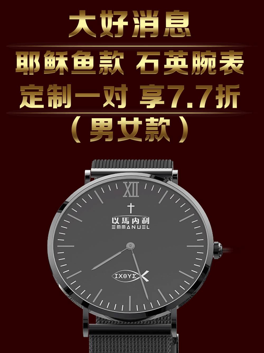 同样,此款情侣石英表,也是预售,也是定制。399元/块,价值跟质量大于等于市面上1000以上的石英表。预计10月5号左右,发货。男3款,女3款,每款首批报名定制各100块。请弟兄姊妹们明确,不能接受的,就不要报名定制了。能明确其中的好处,并能接受精工定制需要等待30天的家人,可以加咱的姊妹咨询定制了。感谢主,愿时时刻刻,分分秒秒,以马内利!