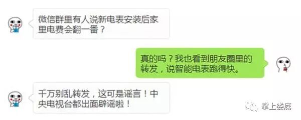 微信安全中心:【谣言】智能电表"跑得快",被人为蓄意加速多收费:“电表被蓄意加速”的传言已流传10年之久,相关部门也在通过媒体不断进行辟谣。:智能电表无加速可能。
