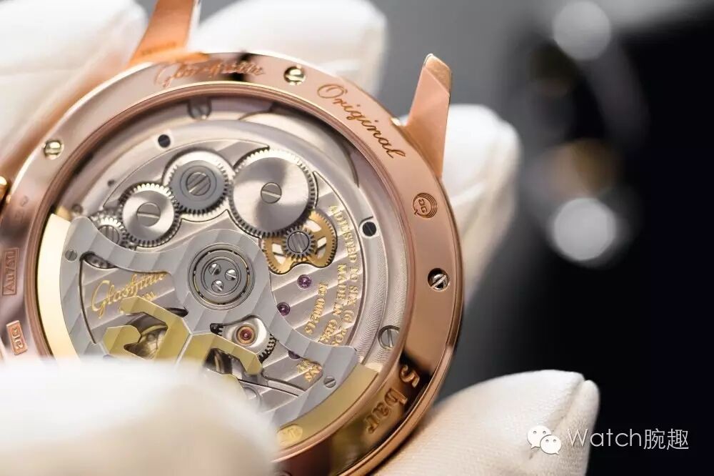 既然注重机芯的效能,当然也不会忽略精致的装饰细节。格拉苏蒂原创的德式工艺特色像是四分之三夹板、镂空21k黄金双G自动陀、雅致的罗纹饰纹、珍珠纹打磨、蓝钢螺丝以及转轮和自动陀轨道上精雕细琢的装饰等等,都可透过透明底来欣赏。另外,不妨试试看手动上链,你可以在过程中清楚的看到链条运转的有趣过程。