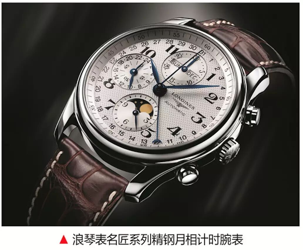 浪琴表名匠系列精钢月相计时腕表,内藏L678自动上炼机芯,每小时摆动28,800次,能量储备为42小时。表款直径40毫米,银色表面压有大麦颗粒图案。显示时、分、秒,。9时位置设24小时表盘;6时位置设月相显示功能和12小时累计表盘;12时位置设30分钟累计表盘,并配备星期与月份显示窗。透明表背使精妙的机芯运作一览无遗。配备棕色鳄鱼皮表带,防水功能达3巴 。
