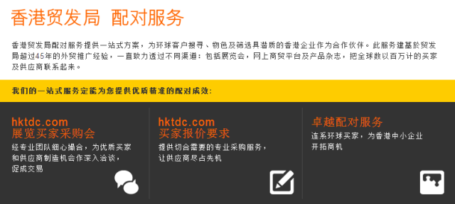 香港贸易发展局(贸发局)在全球举办超过340项贸易展览及推广活动、560项交流会或外访团,以及接待约650个访港贸易团,协助香港中小企联系全球业务伙伴。透过遍布全球的44个机构,提供专业而实用的全球营商资讯,以及强大的附加服务。涵盖投资设厂、市场策略、产品内销、报关实务、经贸法律、税务疑难、商品检验、商标专利等多个范畴,特别是发展内地市场遇到的常见问题。来自香港多个专业机构的顾问提供免费的一对一咨询服务,解决运营困难;咨询范围包括出口信贷管理及融资方法、商贸法律、信用证运作、知识产权保护、报关实务及香港创业资讯等。知识产权顾问服务:携手专业知识产权顾问,提供免费知识产权咨询服务;服务范围包括知识产权保护及登记、知识产权交易、知识产权管理、特许经营业务市场推广等等。