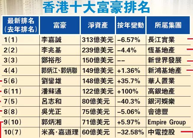 紧随在后排名第二的,仍然是李兆基,净资产高达239亿美元,其身家较一年前“缩水”约4.4%。第三位亦继续是郑裕彤,惟他拥有的净资产维持在150亿美元水平。排名第四位也是地产界人士,是新鸿基地产(00016)的郭炳联及郭炳江兄弟,拥有净资产合计149亿美元,轻微上升近1.4%。