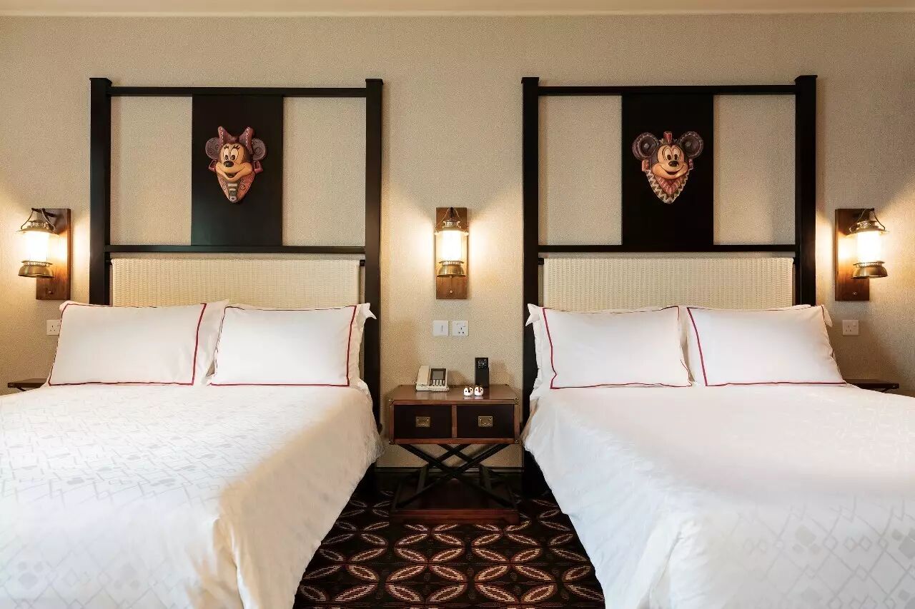 房间内没有过多的元素,但每一个细节都做得很到位,米奇和米妮型的面具挂饰,床头灯也是探险用的手提油灯,无论小孩还是大人都会乐在其中。