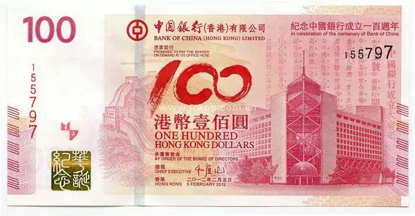 中国银行于1912年2月5日正式成立,历经百年变迁,始终秉承追求卓越的精神,发展成为中国国际化程度最高的商业银行,也是中国唯一持续经营百年的银行。为庆祝中国银行100周年华诞,中国银行香港、澳门分行特于2012年2月6日发行中国银行100周年纪念钞。