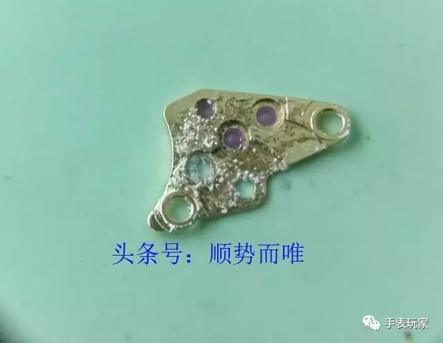 这个就是轮系的盖板内侧,在外面真看不出来啊!拆到这才知道机芯内部的白色粉末是怎么来的了,手表进水后,顾客一开始只是简单烘干处理,表面的水气烘干了,但是没有烘彻底,所以残留在盖板内侧的水慢慢生锈腐蚀,镀层氧化后形成白色腐蚀点,这种情况手表是绝对走不准的!