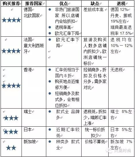 凰尚:凰尚这次也在瑞士实地考察了一下,只能说当地的款式会更全一点,尤其是一些品牌出的限量纪念版会在瑞士找到,但是价格方面的确优惠比较少。为了让大家更清楚地了解世界各地买表价格,凰尚给大家做了一个表格,结果如下,总的来说,还是德国买表更划算哦。
