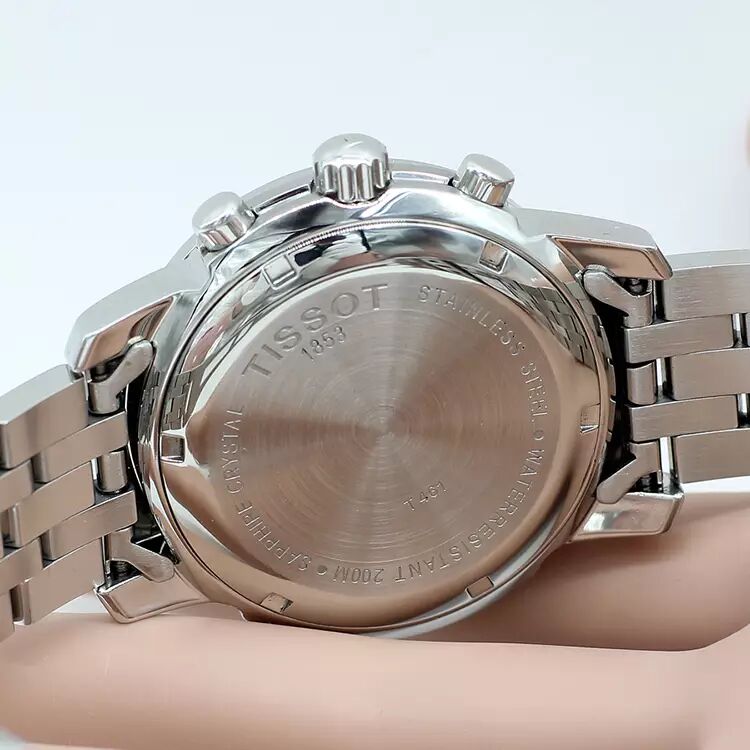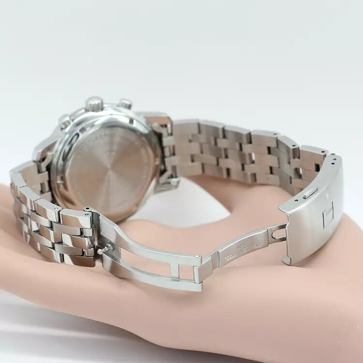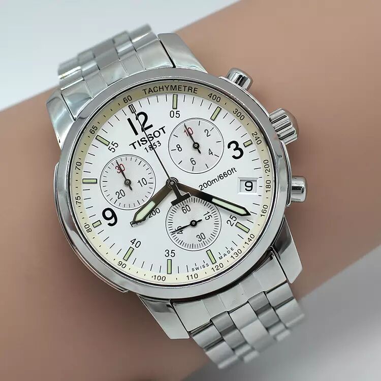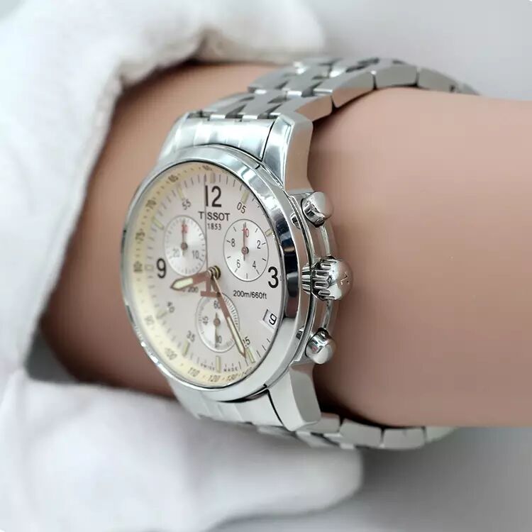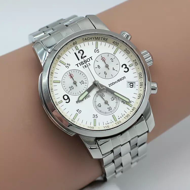 型号:T17.1.586.32,整表精钢打造,完美适中的40MM表径,运动、休闲皆宜。素雅大气的白色表盘,夜光条刻度,蓝宝石水晶镜面,搭载精准省事的石英机芯。 4点位置日历窗口显示,6点位置计时小秒盘显示,10点位置计时分钟盘显示,2点位置十分之一计时盘显示。结实耐用的精钢表链,方便的折叠表扣,夜光凌厉~!