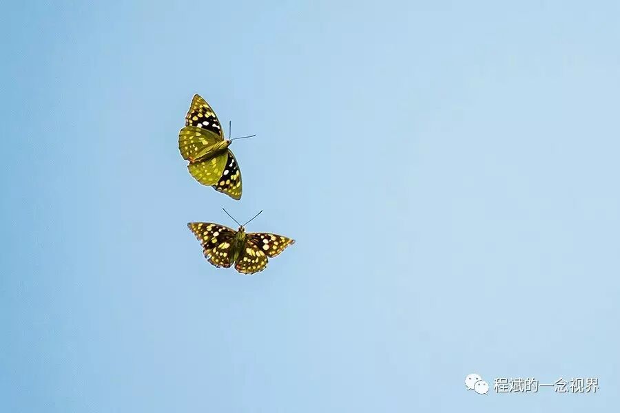为了繁殖交配,每到夏季在南杂木,就会有大量的大紫蛱蝶翩翩起舞,这是它们在进行“婚飞”——即雄蝶会尽可能飞到雌蝶上前方,以使自己的雄性荷尔蒙能引诱雌蝶和其交配。在中国传统绘画中,彩蝶双飞是常见的题材,但在蛱蝶类的摄影照片中,你很难看到这样的画面。这是因为蝶类体型小,两只蝴蝶在动态飞行中要用长焦镜头完成拍摄,难度很大。对于大紫蛱蝶这类飞行速度极快的蝴蝶来说,这样的画面就更难得了。
