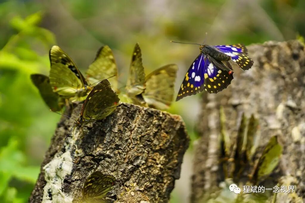 “扑棱……扑棱……”的声音在空气里由远及近,这是大紫蛱蝶飞行时那有力的翅膀震动空气发出的,像是武侠小说里描述的飞镖之类的暗器,一只羽化不久的大紫蛱蝶迅速地从我眼前飞过。蓝紫色的翅膀在暗绿色的树林背景里若隐若现,我的目光完全被它吸引了,直到它落在不远处的一个树桩上。这时我才发现这根突兀的枯树桩上,上上下下竟然落了几十只大紫蛱蝶,大多数合着翅,像是一片片黄黄的枯叶,只有个别的展着翅。一阵风吹过,一股奇臭的味道扑鼻而来。
