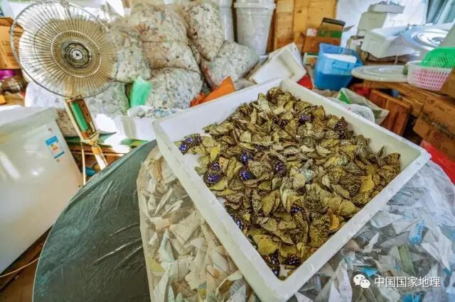 在我国其他地区大紫蛱蝶因为生性机警、飞行速度快,很难被捕捉。但在南杂木,捕蝶却变成了一件容易的事儿,再加上这里的大紫蛱蝶个头大、色彩艳丽,所以南杂木成了我国蝴蝶市场上大紫蛱蝶的重要货源地。蝴蝶商人会对收上来的蝴蝶进行筛选,翅型完整的会被制成标本,我国90%以上的大紫蛱蝶标本就出自于此。不够完整的蝴蝶则会被用作“蝶画”——取蝴蝶之翅,剪贴拼接成画。