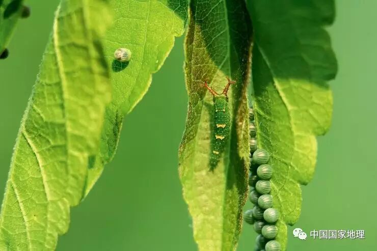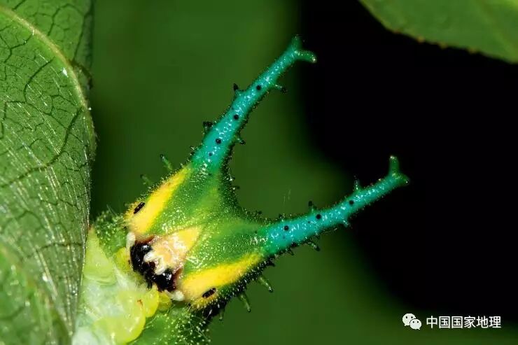 大紫蛱蝶一次产卵40—60粒,着卵的部位大部分在叶片的表面,有的产在叶柄和小枝上。仔细观察你会发现这些卵非常漂亮,它们整体呈翠绿色,每粒卵的表面有18-22条纵脊,顶部有一个小孔(供产卵一瞬间受精用的),看上去就像一个个微缩版的小西瓜。蝶卵经过一周时间,渐渐由绿色变成黑褐色,再过数天,蝶宝宝——毛毛虫就会咬破卵壳,探出身来。刚爬出卵壳的幼虫称一龄幼虫,以后每脱一次皮就增加一龄。到了二龄期,大紫蛱蝶的幼虫会完全变了一个模样,头部长出一对分岔的“犄角”,背部出现了四对带有防御机制的棘刺,好像身披铠甲的武士(上图 摄影/刘家柱)。上图为幼虫头部特写,许多人都觉得它们的怪模样看上去“萌萌哒”(下图摄影/李凯)。