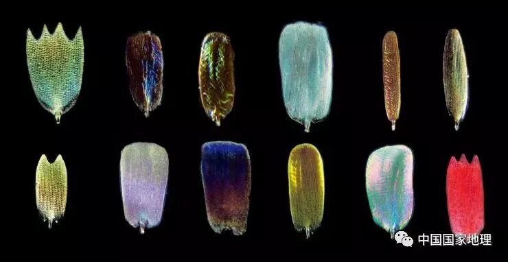我们都知道蝶翅上有一层“粉末”,这些“粉末”其实是鳞片。在高倍显微镜下,我们可以看到鳞片像瓦片一样紧密排列,附着在翅膜上。如果刮去鳞片,你会发现剩下的翅膜轻薄透明,没有任何色彩。这些鳞片就像显示屏上的像素点,它们组合在一起就形成了蝶翅上美丽的色彩。大紫蛱蝶在不同角度下会显示出从蓝到紫的色彩变化,这是因为在一些鳞片上有着特殊的光学结构(如脊线或深沟等),当光源种类、光向不同时,光线经过鳞片时会发生不同的折射、反射、干涉,最终就会呈现出不同的颜色。