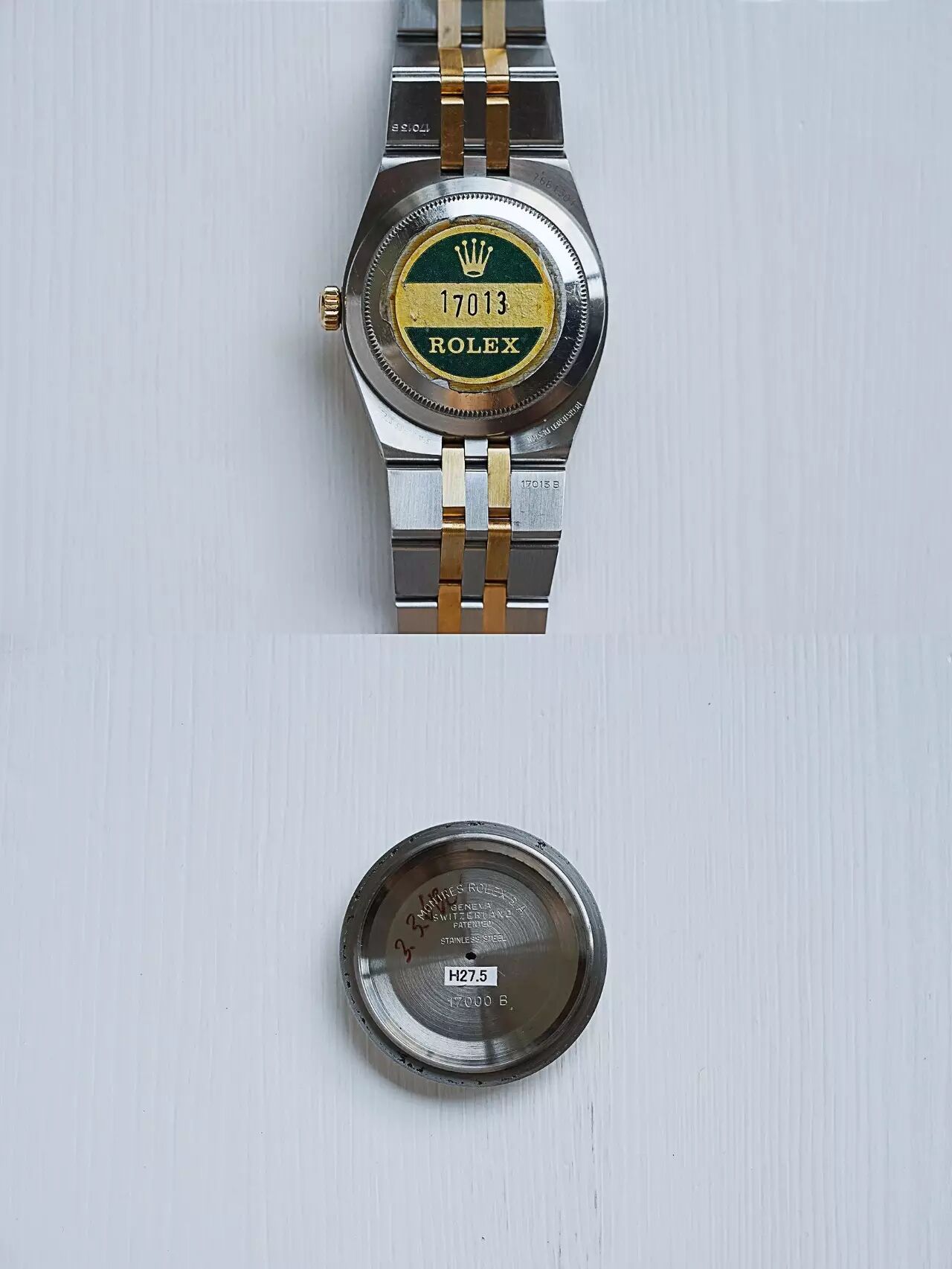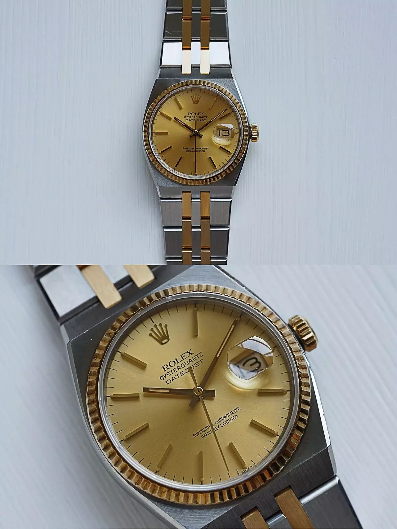 这枚1982年瑞士生产 / 型号17013 / 有着劳力士一贯的经典风格 / 黄金三角坑纹表圈 / 金色表盘保存完美 / 夜光已经氧化成美丽的金黄色 / 一体式设计的表壳与表链风格独特 / 黄金与钢相间 / 表壳直径36mm / 内藏相同的石英机芯5035 / 底盖标签都尚未揭去