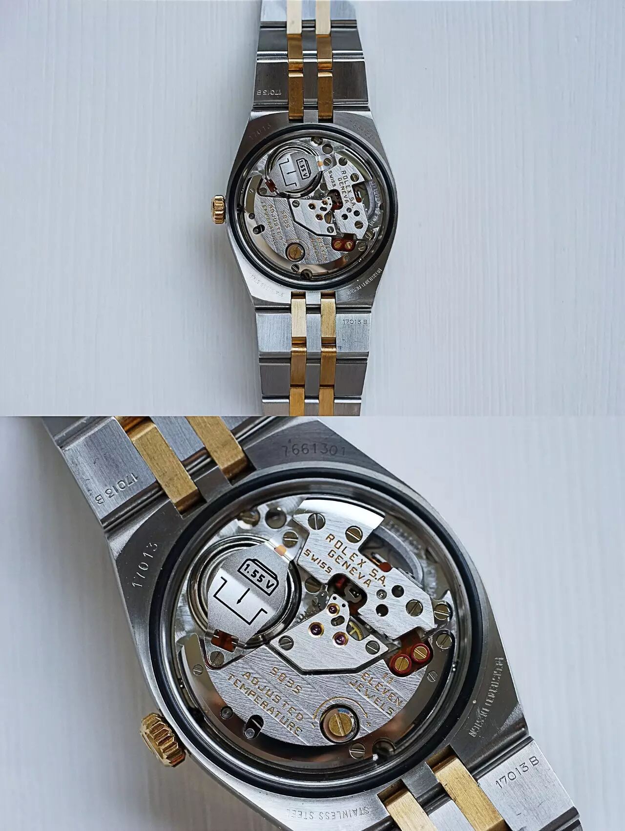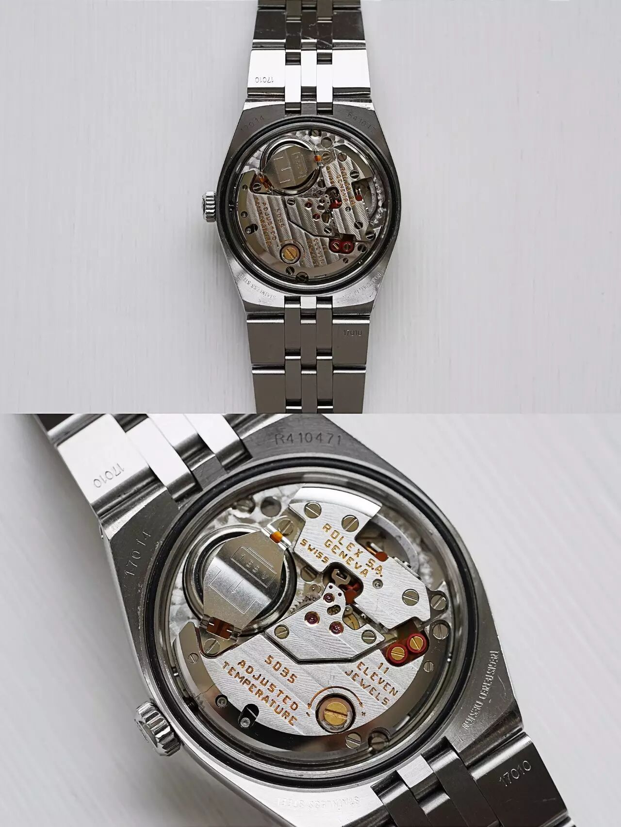 这枚1987年瑞士生产 / 型号17010 / 1977年 / 在经过了五年的设计 / 开发和测试 / 劳力士正式公布其完全自制的石英机芯Cal.5035以及用于Day-Date系列的Cal.5055 / 劳力士石英时代自此开始 / 从上世纪七十年代开始一直到2001年劳力士石英腕表停产 / 一共生产了大约25000只劳力士石英表而已 / 这枚腕表有着劳力士一贯的经典风格 / 白金三角坑纹表圈 / 表盘保存完美 / 一体式设计的表壳与表链风格独特棱角分明 / 表壳直径36mm / 内藏一颗我所见过最精美强悍的石英机芯5035 / 即使到了今天 / 仍未有任何表厂所生产的石英机芯可以与其比拟 / 若单以机芯外观来说 / 这枚5035石英机芯的配置及打磨比很多高级的机械机芯有过之而无不及
