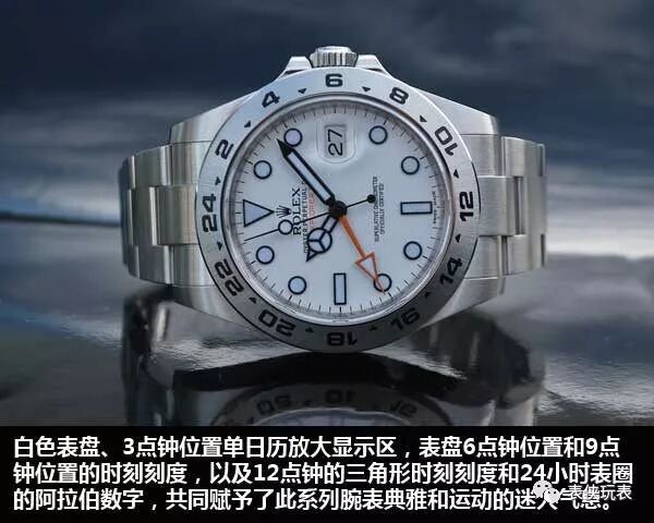 劳力士探险家(Explorer)II系列腕表一向是劳力士最热门、最富吸引力的表款之一,白色表盘、3点钟位置单日历放大显示区,表盘6点钟位置和9点钟位置的时刻刻度,以及12点钟的三角形时刻刻度和24小时表圈的阿拉伯数字,共同赋予了此系列腕表典雅和运动的迷人气息。