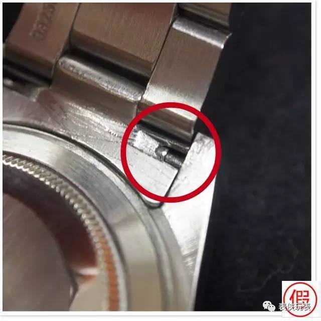 仿品使用的是,市面上手表常用的廉价弹簧棒,螺丝钉的部分会暴露出来。